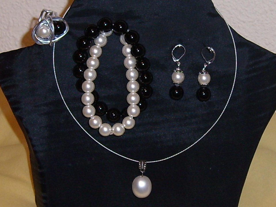 Juego de collar con perlas en color plomo con pendientes y anillo a juego.